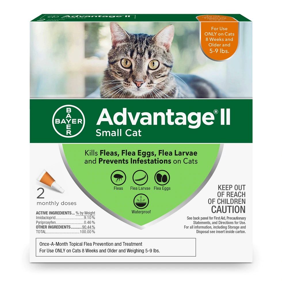 4-month supply of advantage II flea prevention for small cats 5 to 9 pounds; Advantage II 4-dose small cat flea prevention kills fleas through contact meaning fleas dont have to bite your cat in order to die; Easy-to-apply and pre-measured application tubes fragrance-free and waterproof after 24 hours; Vet recommended fragrance free and designed specifically to treat and prevent fleas on cats