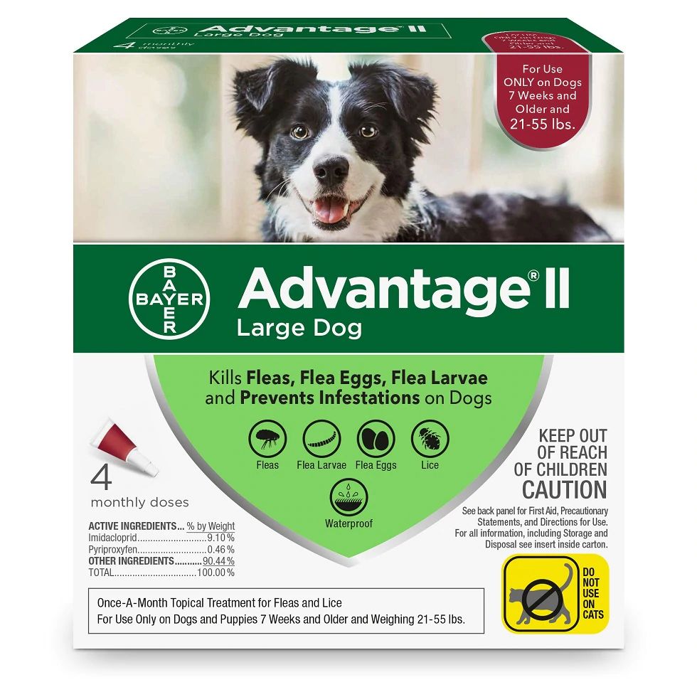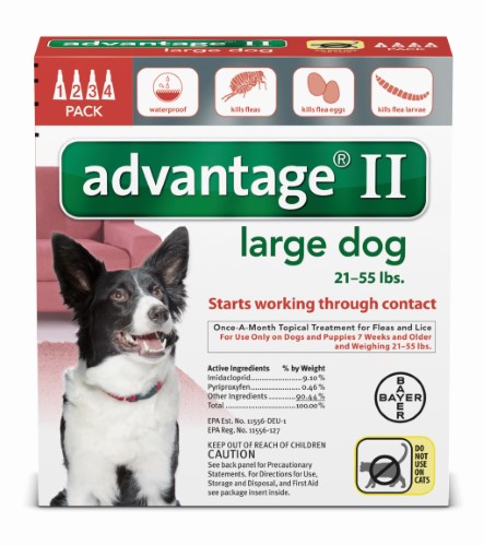 Advantage II topical flea treatment for large dogs weighing 21 to 55 pounds is a vet-recommended monthly application that kills fleas through contact so they dont have to bite your dog to die. Even indoor dogs need flea protection because humans and other pets can bring fleas into your home. The protection of Advantage II dog flea treatment kills fleas in multiple life stages including eggs larvae and adults effectively breaking the flea life cycle to prevent flea infestation on your dog. This 4-dose dog flea treatment comes in a convenient topical liquid that is easy to apply fragrance-free and waterproof after 24 hours. A single application of Advantage II flea treatment for dogs starts working in 12 hours and keeps killing fleas for 30 days. Advantage II flea control for dogs is available in packs of four or six monthly applications for dogs of all sizes. Fight the misery of biting fleas with the help of Advantage II 4-dose flea treatment for large dogs.Specifications