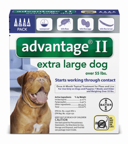 Advantage II topical flea and lice treatment for extra-large dogs weighing over 55 pounds is a vet-recommended monthly application that kills fleas through contact so they dont have to bite your dog to die. Even indoor dogs need flea protection because humans and other pets can bring fleas into your home. The protection of Advantage II kills fleas in multiple life stages including eggs larvae and adults effectively breaking the flea life cycle to prevent flea infestation on your dog. This 4-dose dog flea treatment comes in a convenient topical liquid that is easy to apply fragrance-free and waterproof after 24 hours. A single application of Advantage II flea treatment for dogs starts working in 12 hours and keeps killing fleas for 30 days. Advantage II flea control for dogs is available in packs of four or six monthly applications for dogs of all sizes. Fight the misery of biting fleas with the help of Advantage II 4-dose flea and lice treatment for extra-large dogs.Specifications