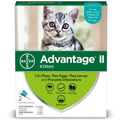 2-month supply of Advantage II topical flea prevention for kittens 2 to 5 pounds; Advantage II works through contact so fleas dont have to bite your cat to die; This effective flea treatment kills fleas in multiple life stages: eggs larvae and adults to break the flea life cycle; Vet recommended fragrance free and designed specifically to treat and prevent fleas on cats