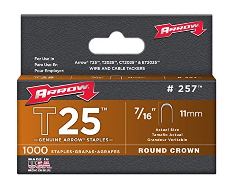 The Arrow 257 T25 7/16 inch 1/4 inch wide staple each box has 1000 pieces. Fits Arrows T2025 T25 Staple Gun and ET2025 Electric Staple Gun. Also fits Stanley model CT10C.Specifications