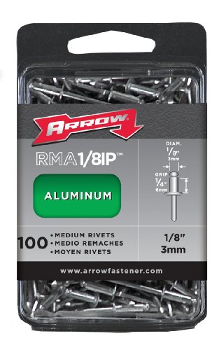 Quickly and easily produce a strong permanent and tamper proof joint with the Arrow Fastener short aluminum rivet industrial pack. Durably constructed to prevent rivet from stripping out or vibrating loose like threaded fasteners. Specially designed for joining sheet metal aluminum fabrics plastics or leather and for use on metal cabinets aluminum doors and windows metal fixtures automobiles heating ducts gutters or downspouts. The carded industrial pack is available in a 100 count 1/8-inch diameter and 1/8-inch grip max. For use with Arrow model RH200S RHT300 and RL100S.Specifications