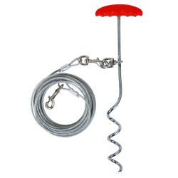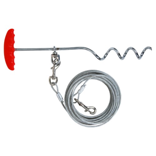 Aspen Pet containment products give dogs the freedom they crave while keeping them safe and out of trouble in the absence of a fence. Containment Stakes are durable and easy to install in all types of soil. Aspen Pet Easyturn Stake with Tie-out is just the thing to give your dog freedom of movement while keeping him safely contained to a specific area. Quick and easy-to-install stake screws into ground and stays firmly anchored with dual wedge plate anchors that prevent pullout. Domed styling eliminates problems caused by handles protruding from ground. Super strong solid steel shaft. Double welded. Features 360-degree swivel ring to attach tie-out cable. Malleable swivel gives pets 360 degrees of roaming and no tangle freedom.Specifications