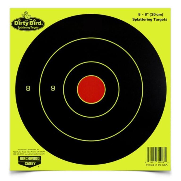 The 8 Round Targets Are Ideal For Near And Mid-Range Shooting Using A Variety Of Calibers; These Targets Offer Yellow Reaction To The Classic Dirty Bird Splattering Performance; Use With A Variety Of Calibers; Yellow Splatter Offers Superior Downrange Contrast