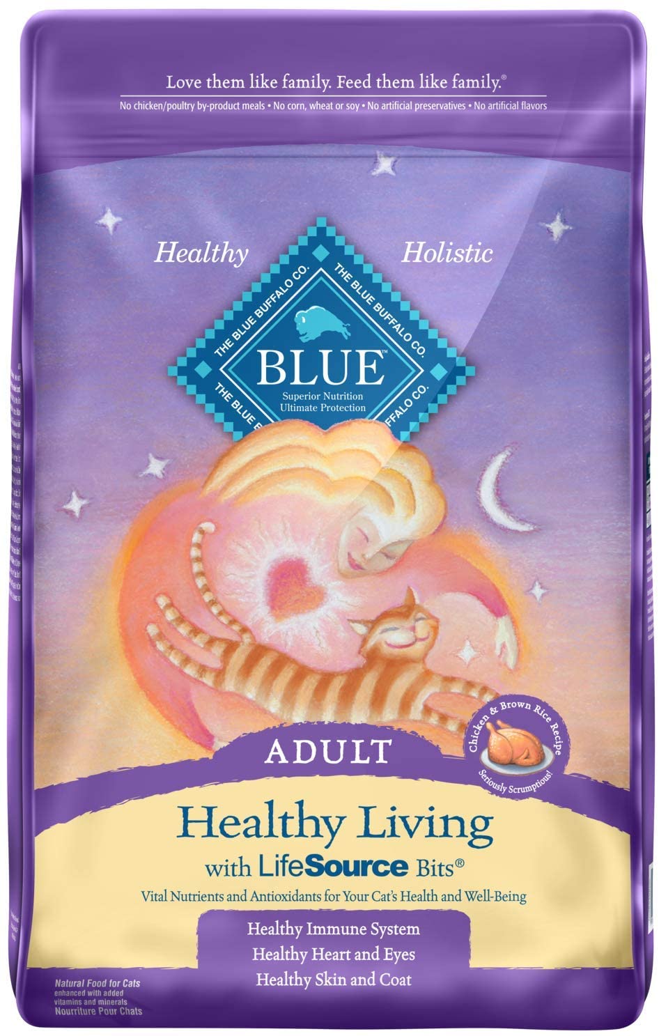 Blue Buffalo Healthy Living Chicken & Brown Rice Recipe Adult Dry Cat Food made with real chicken and turkey as the first ingredients along with wholesome brown rice, barley, oatmeal and superfoods like cranberries, pomegranate, blueberries, spinach and more, it packs everyday complete nutrition into every bite. It's loaded with LifeSource Bits, an active blend of vitamins, minerals and antioxidants to support immunity, plus omegas, taurine and essential amino acids so it provides all the nutrients your pal needs to look and feel his best. Plus, it helps maintain healthy digestion for happy tummies with probiotics and prebiotic fibers in every bite. Formulated to support the health and well-being of your feline friend, BLUE for Cats features only the finest natural ingredients: Delicious, protein-rich Deboned Chicken, wholesome whole grains and veggies NO chicken (or poultry) by-product meals. Our natural BLUE Healthy Living Adult Cat food is made to support the needs of cats in theSpecifications