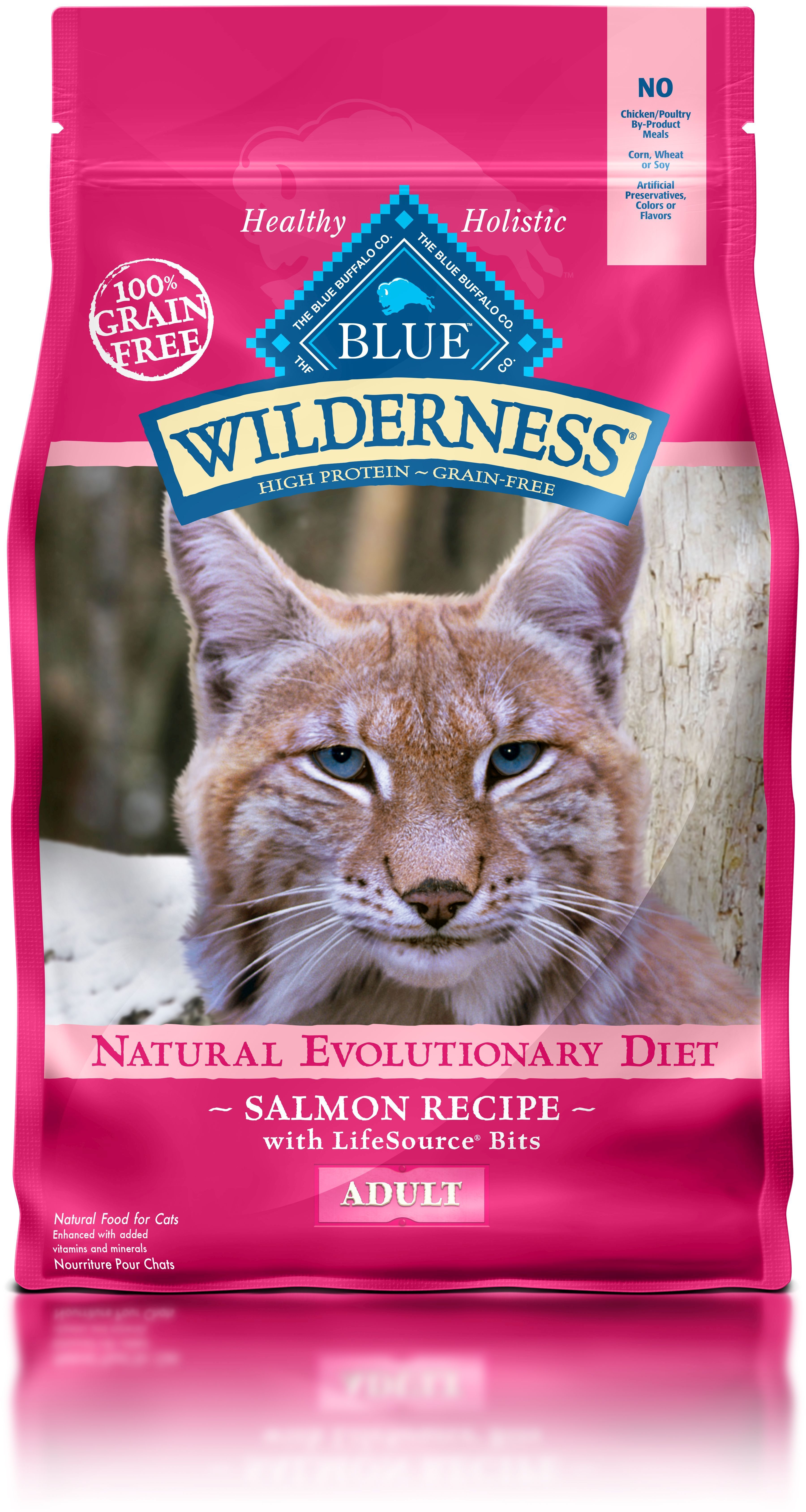 Blue Buffalo Wilderness Grain Free Salmon Recipe Dry Cat Food is a nutrient rich food that will satisfy your cat's wild side. Loaded with more tasty deboned salmon to supply the protein your feline friend needs, Blue Buffalo Wilderness Grain Free Salmon Recipe Dry Cat Food is a well-rounded blend of ingredients that not only provides complex carbohydrates by using sweet potatoes, peas, and potato, but also blueberries, cranberries, and carrots to support antioxidant enrichment and urinary tract health. Feel great about feeding your cat because this food contains NO chicken or poultry byproduct meals artificial preservatives corn wheat or soy. Because Blue Buffalo Wilderness is made with no grains, it's also an ideal choice if you prefer to feed your cat a gluten - free diet.Contains NO artificial preservatives and NO corn, wheat or soy. Raw diets are less convenient to prepare than BLUE Wilderness cat food.Hairball & Odor control. Urinary tract health support.Specifications