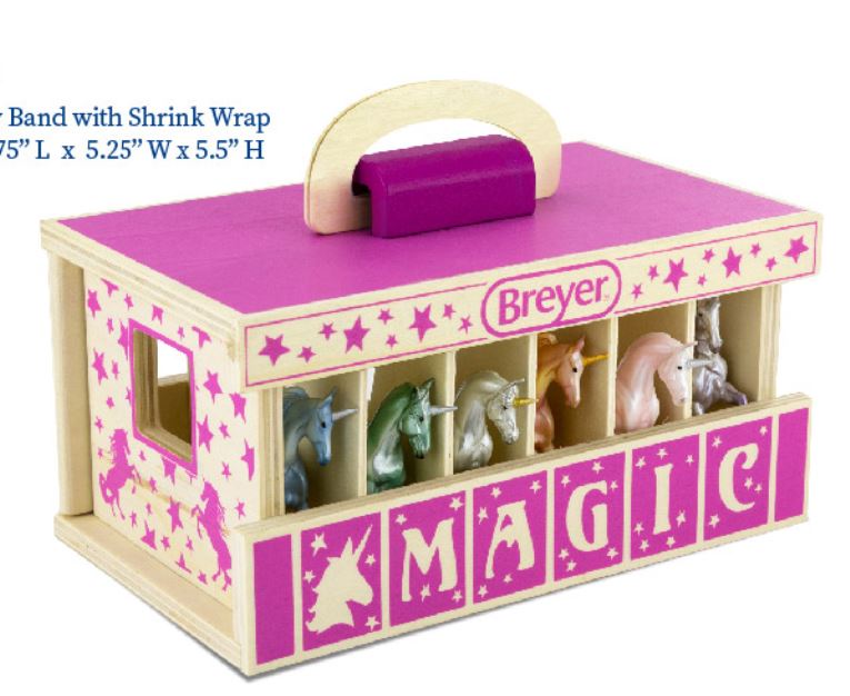 Accessories - Build a whole world with all Stablemates accessories sold separately including craft kits playsets barns vehicles and horse surprise bags.; Authentic Equestrian Art - Breyer models start out as beautiful horse sculptures created by leading Ecuadorian artists that are then cast in a copper and steel mold. Each model is created one at a tim; Handmade Details - The worlds most in-demand horses since 1950. Each Breyer model is hand-prepared and finished then turned over to the paint department for hand-painting and detailing. In short some ; Product Specifications: Package Contains 6 Breyer Stablemates Unicorns 1 Stable Wood Set With Carrying Handle Measures 6.00 H x 9.00 L x 2.5 D. Stablemates 1:32 scale. Each horse is approximately 3; Set of 6 Unicorns: Breyer Farms Unicorn Magic Wooden Carrying Case is a high quality wooden stable that comes complete with 6 Stablemates unicorns. Designed to be easy for little hands to carry the wo