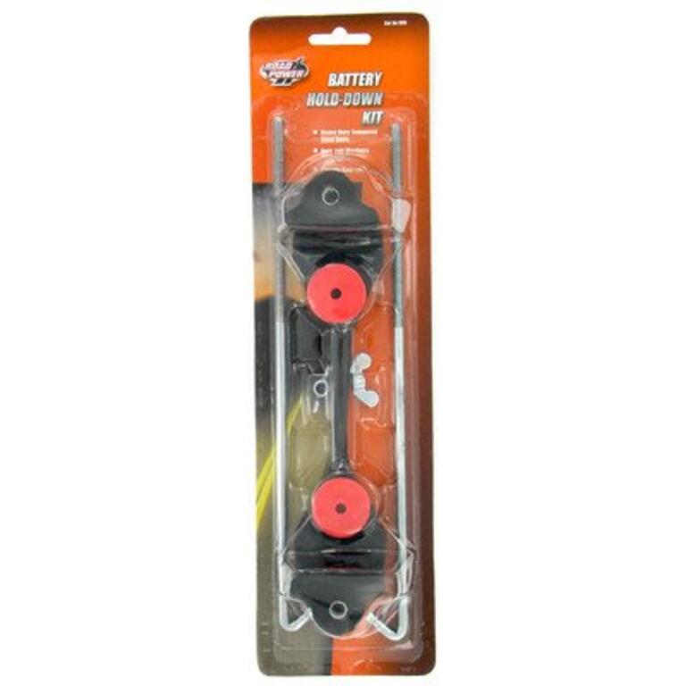 Features: -Battery hold down kit. -Heavy duty tempered steel bolts. -Resists rust and corrosion. -Properly secures battery. -Adjustable J hooks and heavy duty rubber hold down expands to fit most batteries. -Carded. Product Type: -Battery Accessories. Generic Specifications: -Use for most 6 and 12 volt batteries. Dimensions: Overall Height - Top to Bottom: -0.75'. Overall Width - Side to Side: -5.25'. Overall Depth - Front to Back: -13'. Overall Product Weight: -0.6 lbs. Automotive Automotive Equipment Tools Accessories Accessories.