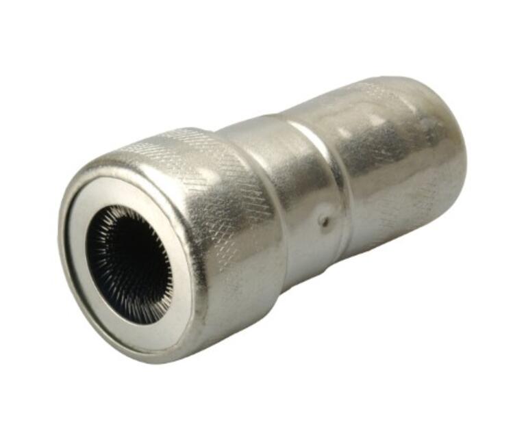 Two-in-one tool removes film deposits and corrosion build-up. Cap pulls off to reveal brush used for cleaning terminals. Opening on bottom of tool designed to fit securely around any size battery post. Carded