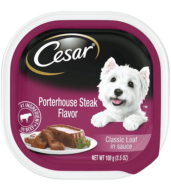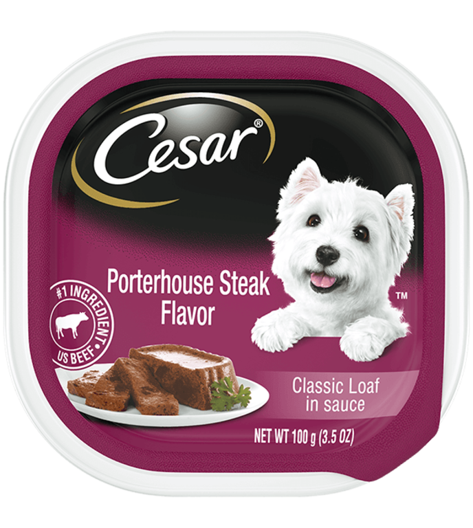 Considered to be the finest cut of beef, the exquisitely tender and flavorful porterhouse is the inspiration for CESAR Canine Cuisine Porterhouse Steak Flavor Classic Loaf in sauce.Specifications