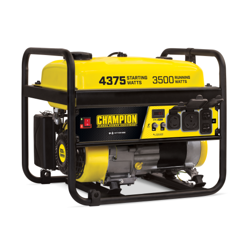 The Champion Power Equipment 100559 3500-Watt RV ready portable generator is the perfect combination of versatility and convenience. A powerful companion for your next camping trip or weekend project this generator can also provide plenty of backup power for your essentials during an outage. For your RV youll enjoy enough power to start and run a 15000 BTU RV air conditioner. Power up with champions reliable recoil start plus Cold Start technology ensures a quick start in cold weather. Champion also makes it easy to monitor voltage frequency and operating hours with Intelligauge. Designed for safety with convenient push-to-reset circuit breakers a low oil shut-off sensor plus an included oil funnel for easy changes this unit has a 0.6 qt oil capacity recommended 10W-30. The reliable 208cc single-cylinder OHV Champion engine produces 4375 starting watts and 3500 running watts and will run for up to 12 hours at 50% load when the 4.7 Gallon tank of gasoline is full. With a noise level ofSpecifications
