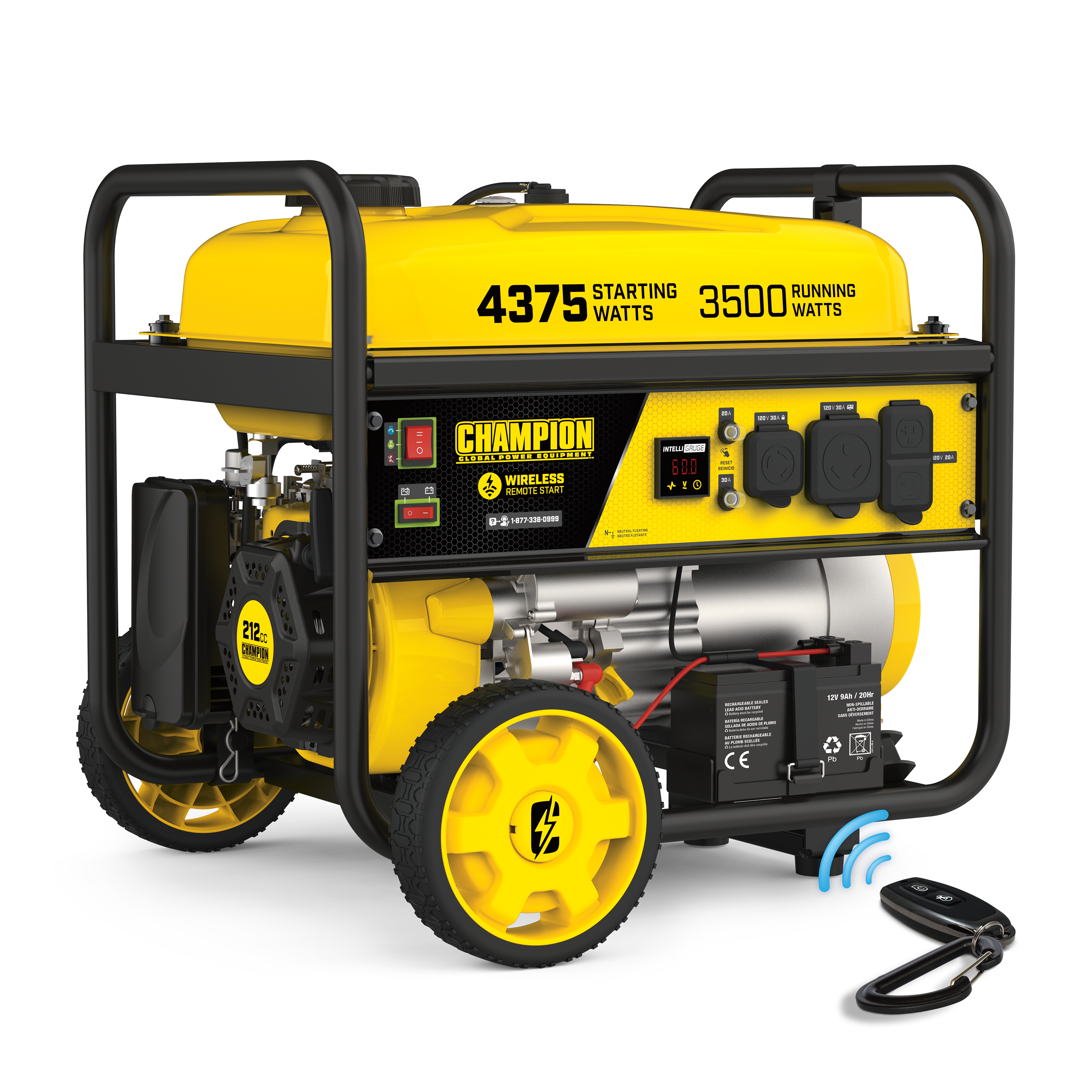 Champion Power Equipment makes powering your life easier than ever with the 200964 3500-Watt RV Ready Portable Generator with Wireless Remote Start. With enough power to start and run a 15000 BTU RV air conditioner you can also use this feature-packed generator to power the essentials in your home the next time theres an outage. For projects the 212cc Champion single-cylinder OHV engine has what it takes to handle the power tools you need.Champions got convenience covered. Starting and stopping your generator from up to 80 feet away with the wireless remote key fob is a snap. The convenient electric start includes a battery plus Cold Start Technology ensures a quick start in cold weather.Champions Intelligauge monitors voltage frequency and operating hours. The foldaway easy-grip handle and included wheel kit with never-flat tires make it a cinch to move your power where you need it.At 4375 starting watts and 3500 running watts this unit can handle your essentials during an outage plusSpecifications