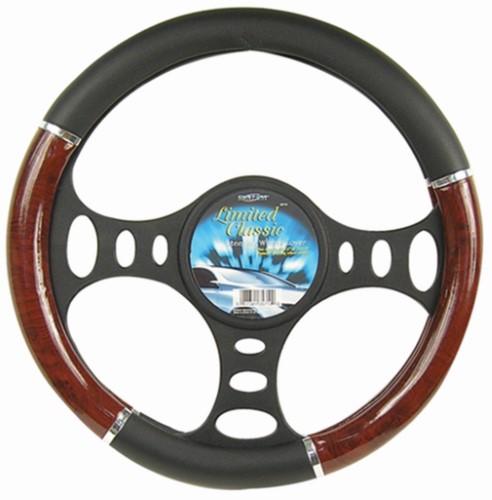 Cover your vehicles steering wheel to add both comfort and fashion in all weather conditions with this Deluxe Steering Wheel Cover. Universal fit design to fits most steering wheels. Soft black leatherette material and wood grain adds classic style to any vehicle. Rubber core allows for universal fit. Gives your steering wheel a new look and feel.Specifications