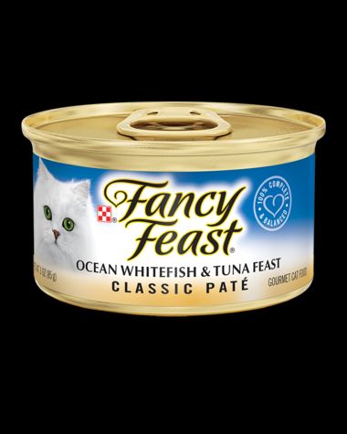Satisfy your cat's craving for seafood with Purina Fancy Feast Classic Ocean Whitefish & Tuna Feast wet cat food. This enticing blend of ocean whitefish and tuna creates a delicate taste your choosy cat is sure to love, and the classic pate texture is smooth and soft, creating a pleasurable dining experience. Watch your cat revel in the exceptional taste found in each bite, and rest easy knowing you are giving her a grain-free cat food made with high-quality ingredients. Each serving contains complete and balanced nutrition to support her playful lifestyle, so you can feel good about filling her dish. Show your cat that her happiness is at the top of your priority list when you feed her this delectable gourmet pate cat food and explore our other canned cat food varieties to give her a selection of flavors she'll fall in love with.Specifications