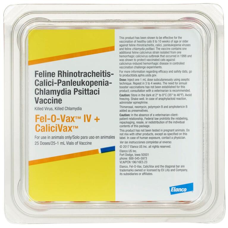 Fel-O-Vax IV + CaliciVax vaccine prevents Feline Rhinotracheitis Calicivirus Panleukopenia and aids in the reduction of the severity of disease due to Chlamydia psittaci. The vaccine contains one additional Feline Calicivirus strain isolated from one hemorrhagic Calicivirus outbreak that occurred in 1998 and was shown to protect vaccinated cats against Calicivirus-induced hemorrhagic disease in controlled vaccination challenge experiments. Fel-O-Vax IV + CaliciVax is recommended for the vaccination of healthy cats eight to ten weeks of age or older. Contains killed virus and killed Chlamydia bacteria.Specifications