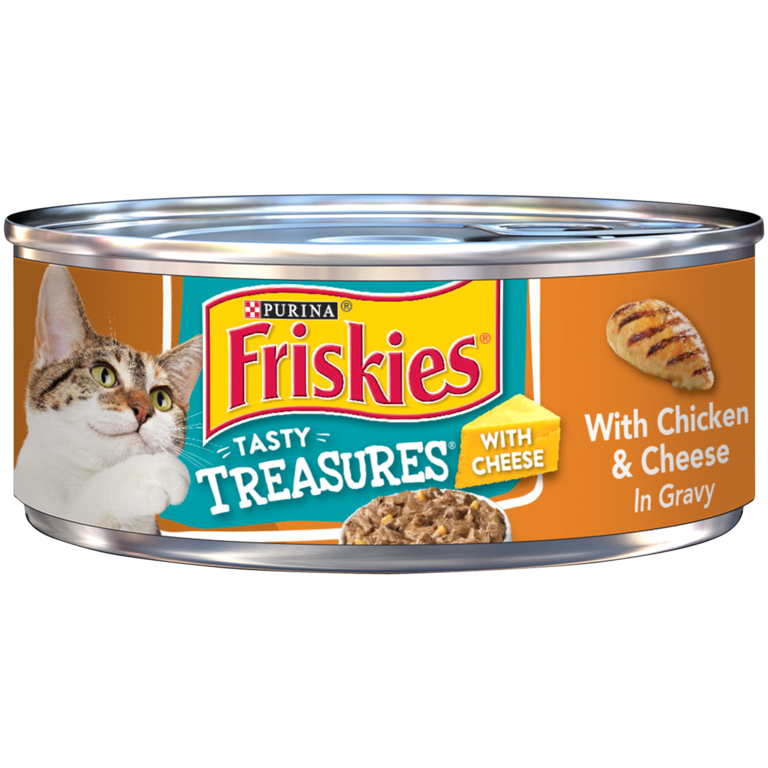 Turn mealtime into a savory special occasion when you serve Purina Friskies Tasty Treasures With Chicken & Cheese in Gravy wet cat food. Real shreds of chicken deliver the classic chicken flavor cats crave, and the succulent gravy and sprinkles of cheese flavor are bound to have her licking her bowl clean.Specifications