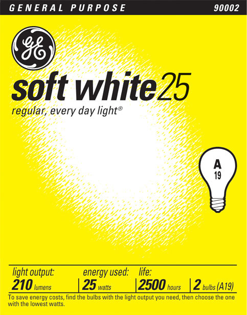 General Electric 25-Watt Soft White Incandescent light. Color temperature rating of 2500 K. Approximate energy cost per year with normal use is about $3.01. Incandescent lamp will provide up to 2.2 years of use on average. Provides approximately 210 lumens of light illuminating your environment around you. Works with most 120-volt lighting fixtures. Incandescent lighting is commonly used for decorative office residential and special purpose lamps. Light is well suited for most General Purpose lighting applications. Using the 25-Watt Incandescent lamp provides about 2500-hours of rated running life which means replacing your bulbs less often. Soft White light adds a unique touch to your projects use GE lighting to finish the job. Incandescent lights from GE represents the state of the art lamps for residential commercial and special purpose use. Lumens are the new Watts use this number instead of Watts to determine the light output or brightness that you prefer. A lumen is a unit of meaSpecifications