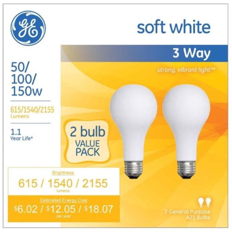 2800K soft white light appearance; A21 shape with medium base for use in table lamps and enclosed fixtures; Estimated yearly energy costs $6.02/$12.05/$18.07 based on 3 hours per day $0.11 per kWh; GE soft white 3-way bulbs provide three levels of light for maximum flexibility low for mood lighting; Use original GEs Soft White when you need a light without glare and harsh shadows