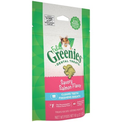 Feline Greenies Savory Salmon Flavor Dental Cat Treats were designed to help keep your cats teeth clean and healthy. Youll be sure to hear happy purrs of joy!Specifications