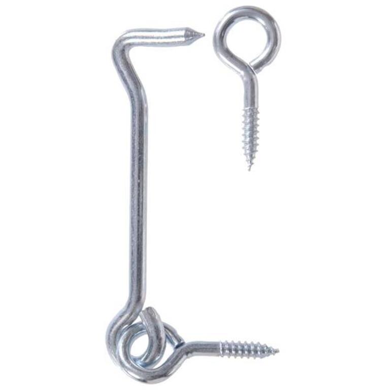 Hardware Essentials Hook and Eye Latches are great for latching gates cabinets doors and more. These robust latches are available in different finishes. Installation tip: drill a pilot hole before use.Specifications