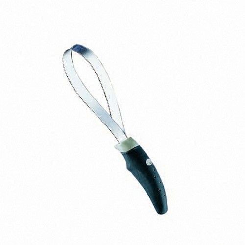 ALSO PERFECT FOR REMOVING LARGE AMOUNTS OF DEAD AND SHEDDING FUR; CURVED OVAL-SHAPED BLADE HAS TINY TEETH THAT RELEASE EVEN THE MOST MATTED PORTIONS OF FUR; METAL TEETH IN TWO DIFFERENT LENGTHS LIFT SHEDDING HAIR FROM UNDERCOAT AND LOOSEN LIGHTLY MATTED FUR; TEETH ARE TURNED IN 90 DEGREES AWAY FROM THE SKIN SO THAT THEY ARE PARALLEL TO THE SKIN RATHER THAN STRAIGHT DOWN TO HELP PREVENT SCRATCHING THE SKIN