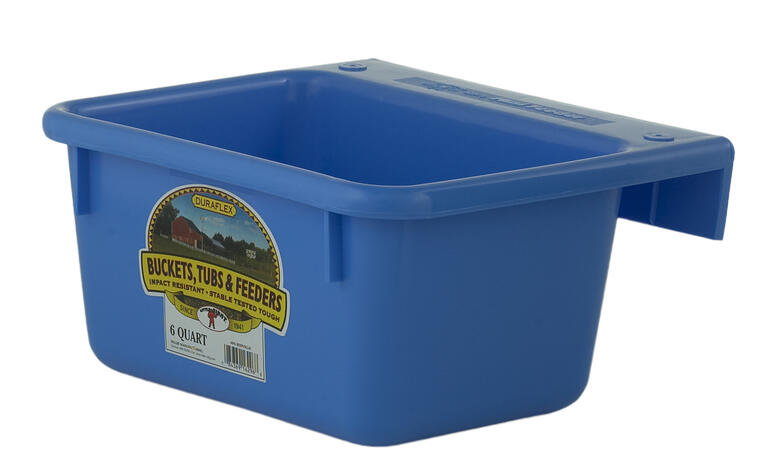 This little feeder is great for foals and other small animals. Built-in bracket hooks over any 2-by-wide board for portable use in barn stall pasture or pen. Two eyelets provided for permanent mounting with screws not included if desired. Made of tough DuraFlex plastic.Specifications
