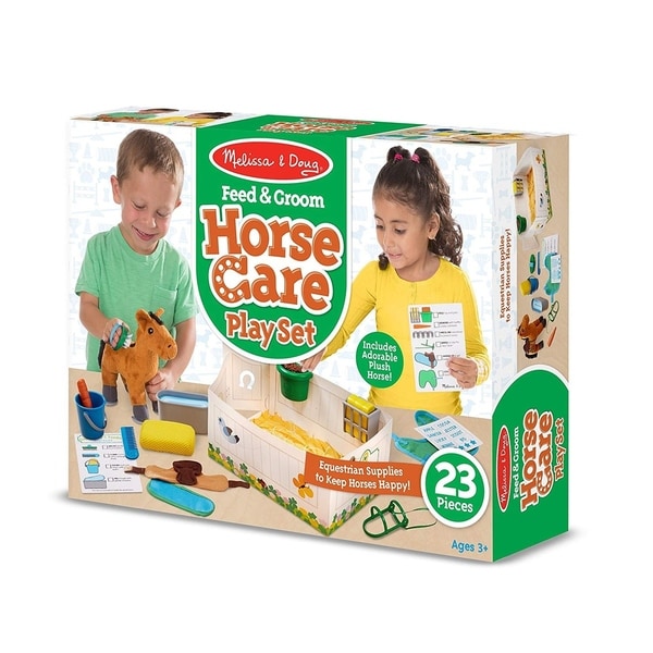 23-Piece pretend play horse care play set with plush horse and feeding and grooming accessories; Includes horseshoes brush comb wash pail sponge grain hay pellet bin hay holder water trough double-sided water insert saddle pad saddle bridle horse blanket name stickers; Reusable double-sided checklist to keep track of horse care responsibilities; Use portable cardstock horse stall as a cozy home for the horse then store all the pieces inside and horse around anywhere