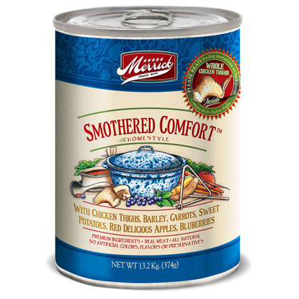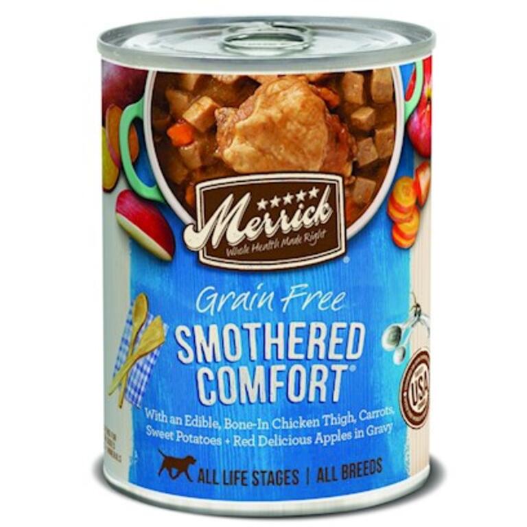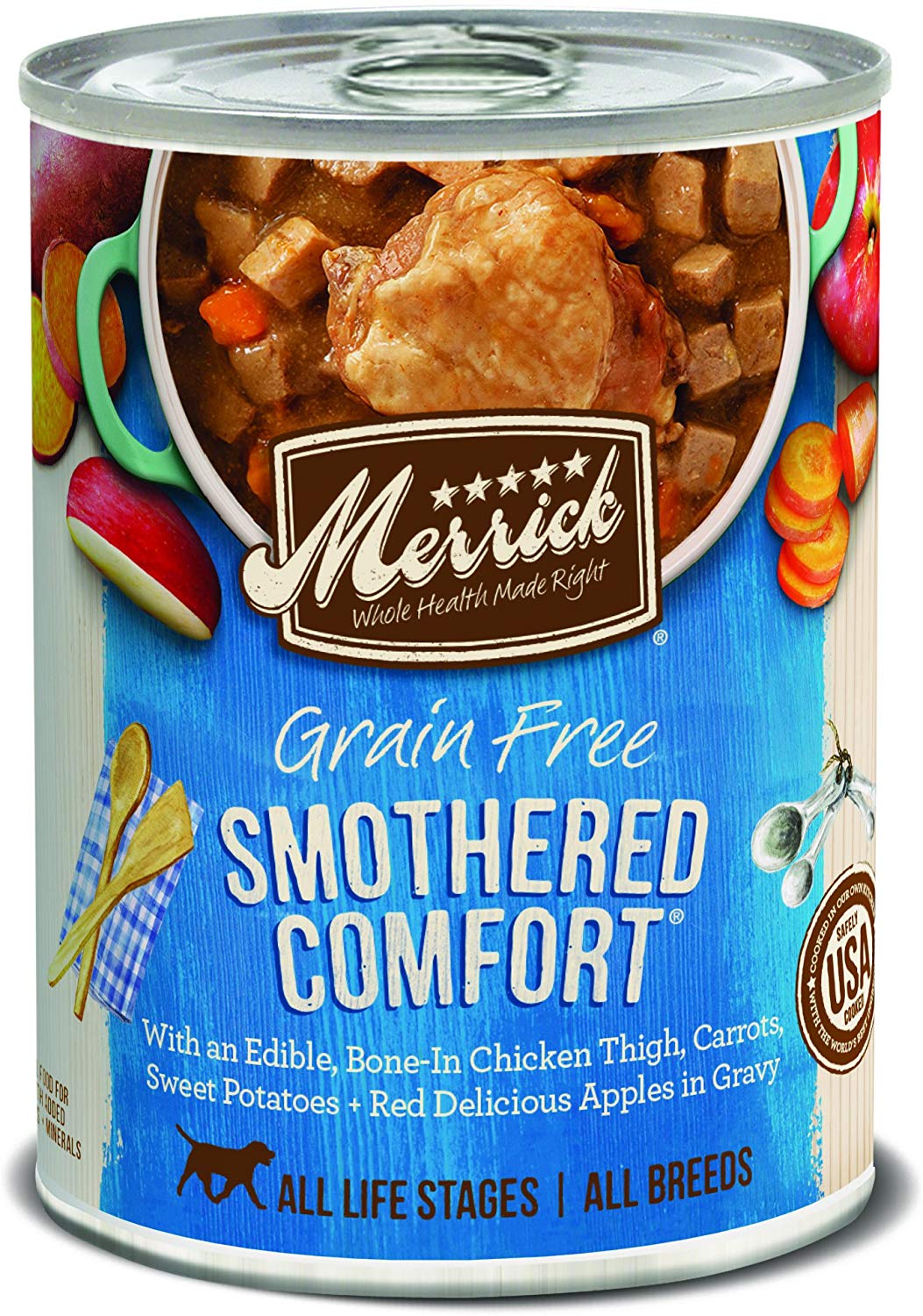Merrick's Smothered Comfort Canned Dog Food features edible safe-to-eat bone-in chicken thigh with all the southern fixins to make any mealtime special. This grain-free recipe mixes carrots, sweet potatoes, and red apples smothered together in a delicious gravy.Specifications