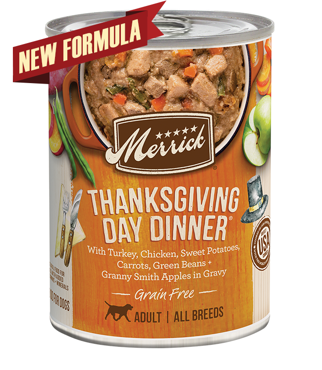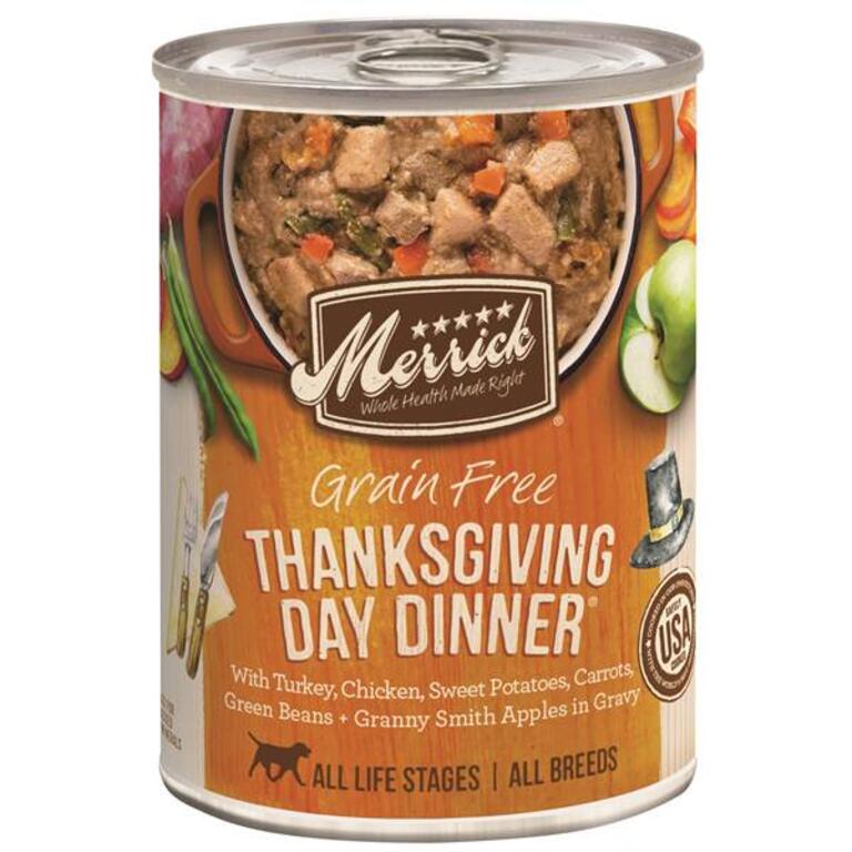 Thanksgiving shouldn't come only once a year, so Merrick created Thanksgiving Day Dinner for your dog to enjoy all year round. This grain-free recipe's first ingredient is big home-style chunks of real deboned USDA inspected turkey prepared with chicken, sweet potatoes, carrots, green beans, and Granny Smith apples all in a gravy that your dog is sure to love.Specifications