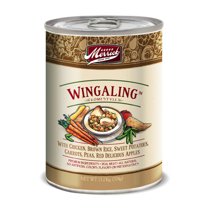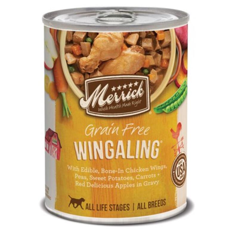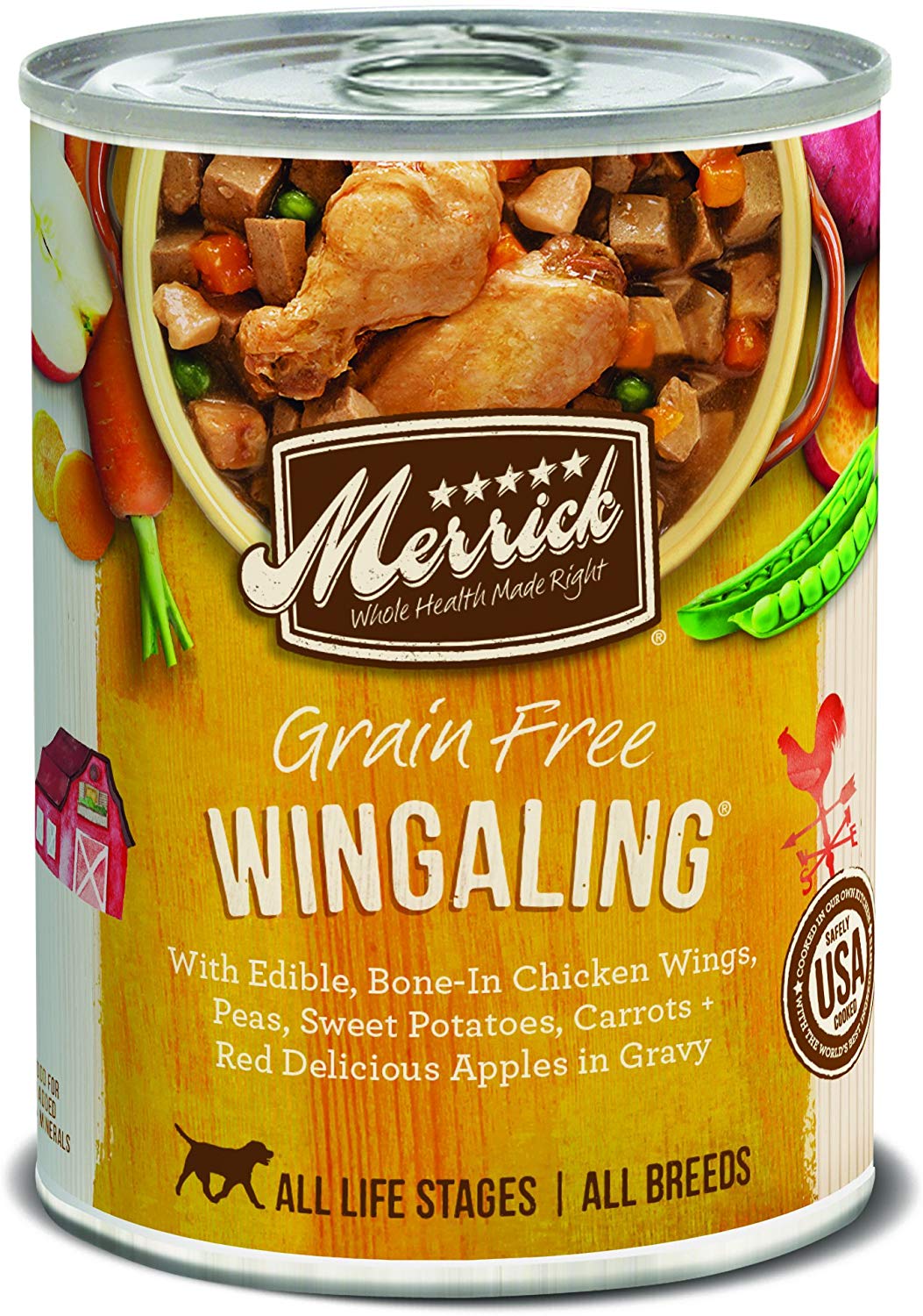 Merrick Wingaling Canned Dog Food features edible, safe-to-eat bone-in chicken wings your dog is sure to love. This grain-free recipe also has peas, sweet potatoes, carrots, and red delicious apples all in a gravy that will makes any mealtime special.Specifications
