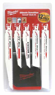 Our 12-Piece SAWZALL Demolition Blade Set features an assortment of our most popular demolition blades for a broad range of professional applications. MILWAUKEE demolition SAWZALL blades are thicker for maximum durability and taller for straighter cuts. This set features The AX for cutting nail embedded wood The Wrecker for your general demolition cutting and The Torch for metal cutting. An adjustable durable storage case is included and can hold up to 9 blades.Specifications