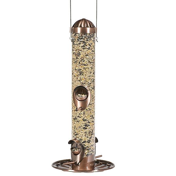 2-IN-1 PORTS ADJUST TO SERVE MIXED SEED OR NYJER; ATTRACTIVE COPPER STANDS OUT IN YARD; FOUR FEEDING PORTS WITH PERCHES TO ACCOMMODATE MULTIPLE BIRDS; HOLDS UP TO 1.8 LB OF SEED; MORE SEED OPTIONS MEANS MORE BIRDS; SEED TRAY FOR EXTRA PERCH SPACE KEEPING SEED MESS OFF THE GROUND