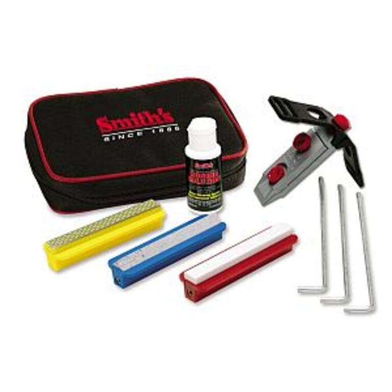 Smith’s Standard Precision Sharpening System offers an easy way to sharpen all types of knives . . . INCLUDING SERRATED. The fabric storage pouch makes this kit portable and easy to store, and the 1/2-inch wide stones makes sharpening safe, fast, and easy. The kit comes with a Coarse Diamond Stone, Fine Arkansas Stone for finishing, a specially-shaped Triangular shaped stone for serrated edges only, and Premium Honing Solution.Specifications