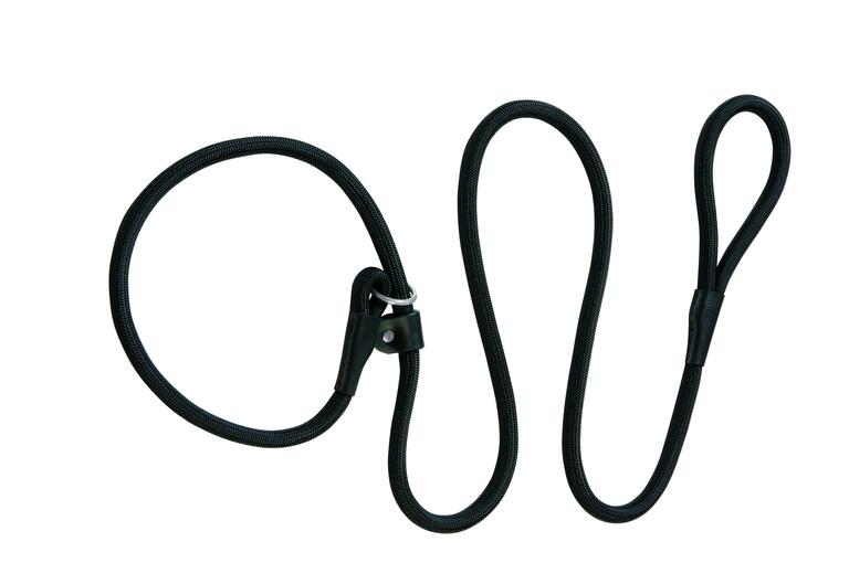 Perfect for training or walking your dog this all-in-one easy-to-use collar and leash is crafted from round braided nylon rope with a polypropylene core. A durable synthetic Brahma Webbslide makes the collar fully adjustable for a great fit on almost any dog. Top grain leather keepers cover the sewn ends for a finished look. Stainless steel hardware. Measures 1/2 wide.Specifications