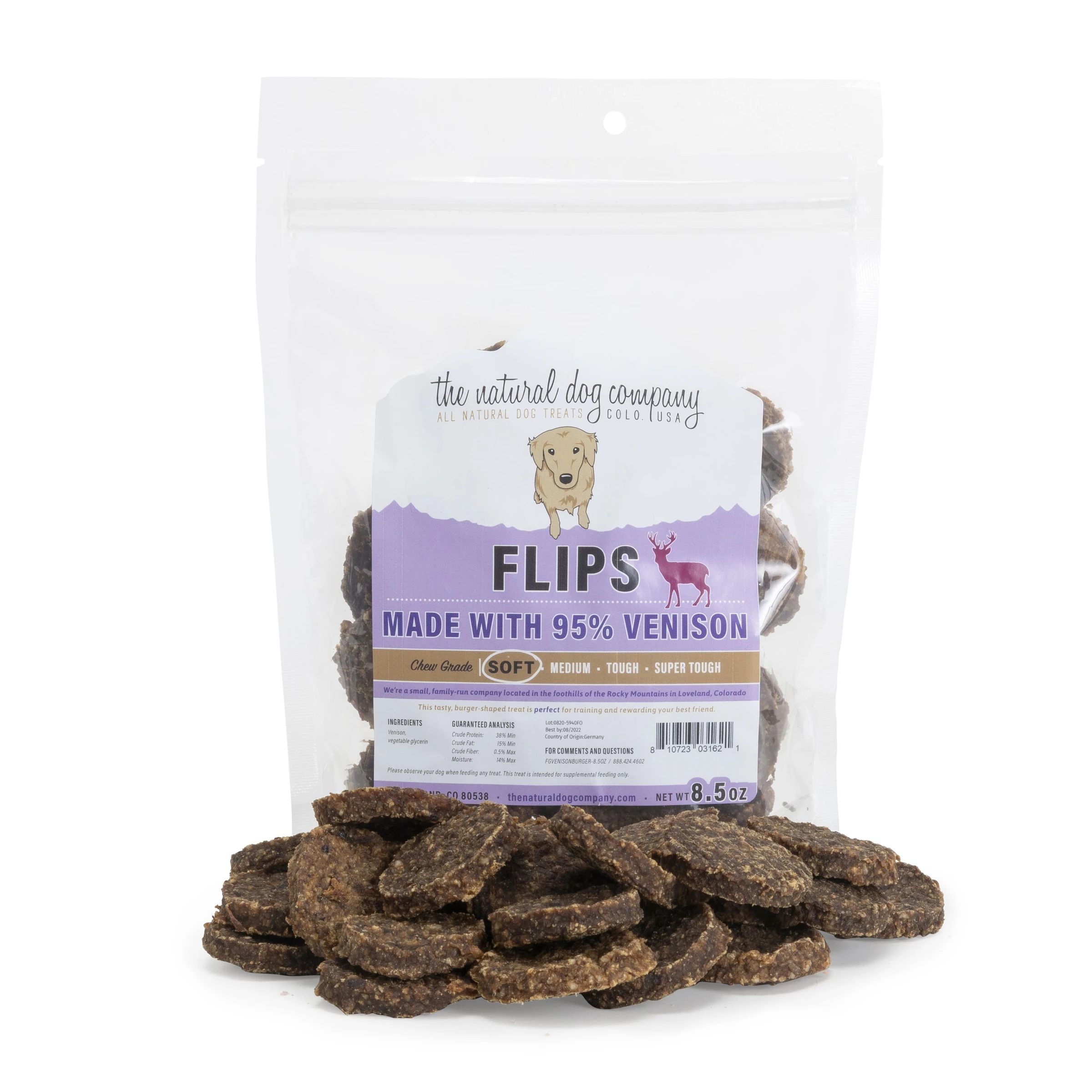With a soft and springy texture, the Natural Dog Company 95% Venison Flips are perfect for training tricks and promoting desirable behaviors.Specifications