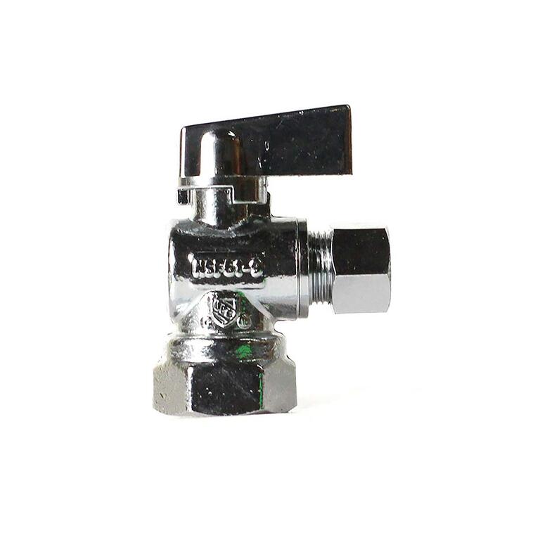Now control the water flow to a number of household fixtures such as toilet faucet icemaker washing machine and dishwasher with Thrifcos quarter turn angle stop valve. Boasting a brass unibody construction thats plated with corrosion resistant chrome the valve offers long term durability. No need to shut off the water supply to your entire household. This stop valve is a low lead certified product and features a brass ball mechanism for smooth operation. The unit also has Teflon seats and brass nuts for a watertight seal.Specifications